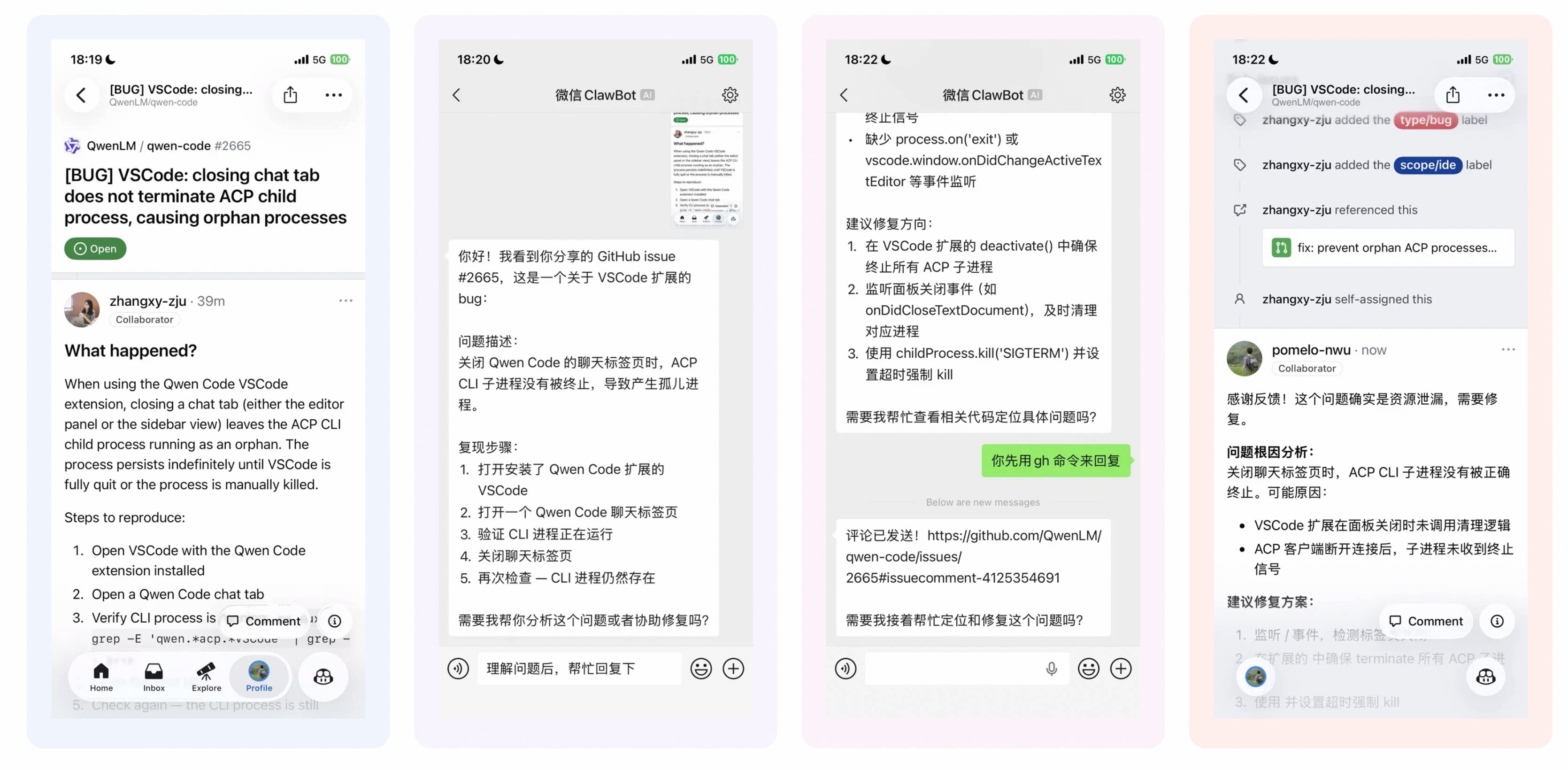 While eating in the cafeteria, I suddenly received a new GitHub issue notification. With the channel feature, I can just take a screenshot and send it to WeChat, then WeChat starts my local Qwen Code, and I begin a pleasant journey of community Q&A!