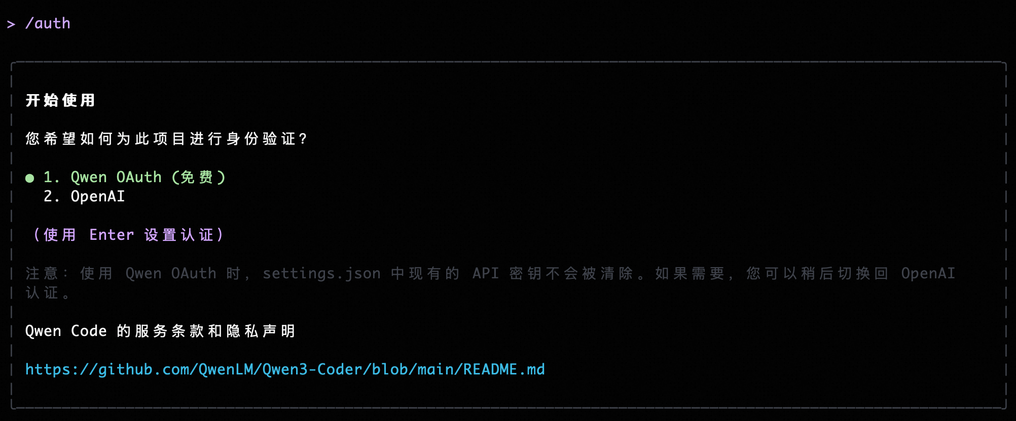 /authin the session and select Qwen OAuth to begin your AI programming journey.