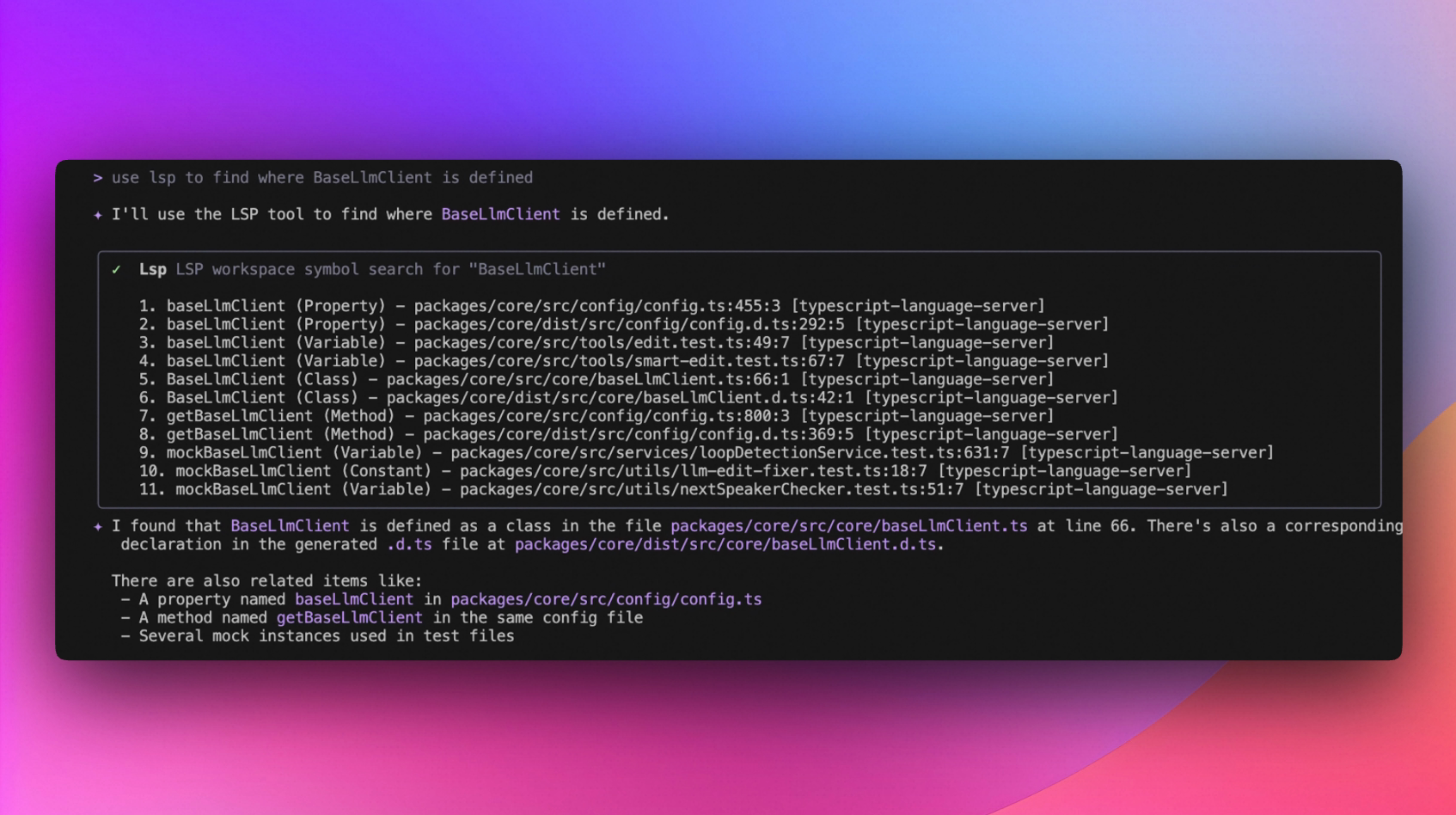 Introduced native Language Server Protocol (LSP) support, enabling advanced code intelligence. This implementation allows AI agents to understand code semantically, not just rely on text-based search.