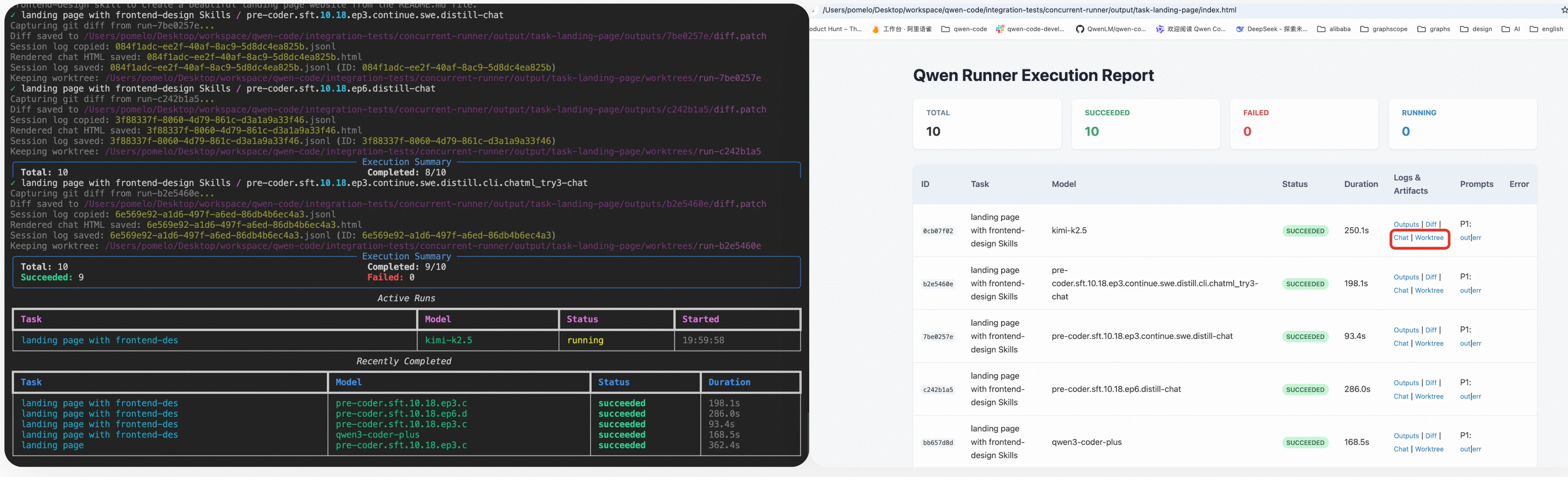 Added a Python-based concurrent executor that runs multiple Qwen Code tasks in parallel using isolated git worktrees. This enables efficient multi-task batch testing and benchmarking across multiple models. Evaluation artifacts and trajectories can be saved locally and viewed online.