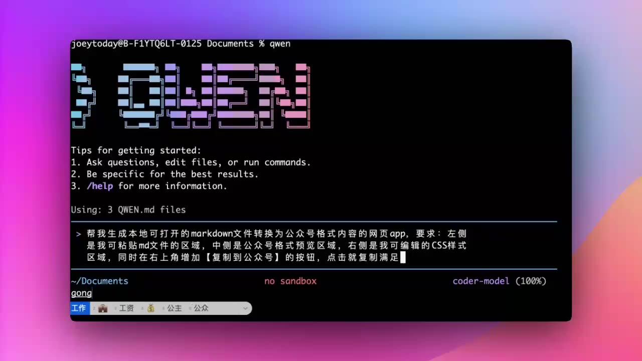 告诉 Qwen Code 要写什么,它会直接帮你写入文件,免去粘贴复制的苦恼